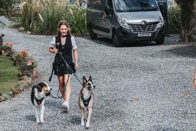 "My German Shepherd is boisterous, young and very strong, she is also fiercely loyal to me. However, the last six months of her daily dog walks have been a huge benefit. She gets excited when she sees her van coming up the drive, she already has her harness on, and her tail never stops wagging. Over the weeks she has become so much more sociable and friendly with other dogs - socialising. She now walks with there other dogs on shared leads and no pulling - magic! Abigail has transformed my lovely dog - definitely a great investment. Thank you very much Abigail.”